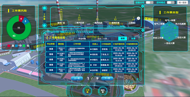 接入電廠的兩票系統和缺陷系統數據,只篩選出當日正在執行的兩票和未完成的缺陷。根據兩票和缺陷的內容通過提前預設好的KKS編碼和關鍵字關聯到設備或者區域上,實現兩票和缺陷分區域分布顯示。將兩票中風險等級高的進行報警顯示,提醒安全管理人員注意。